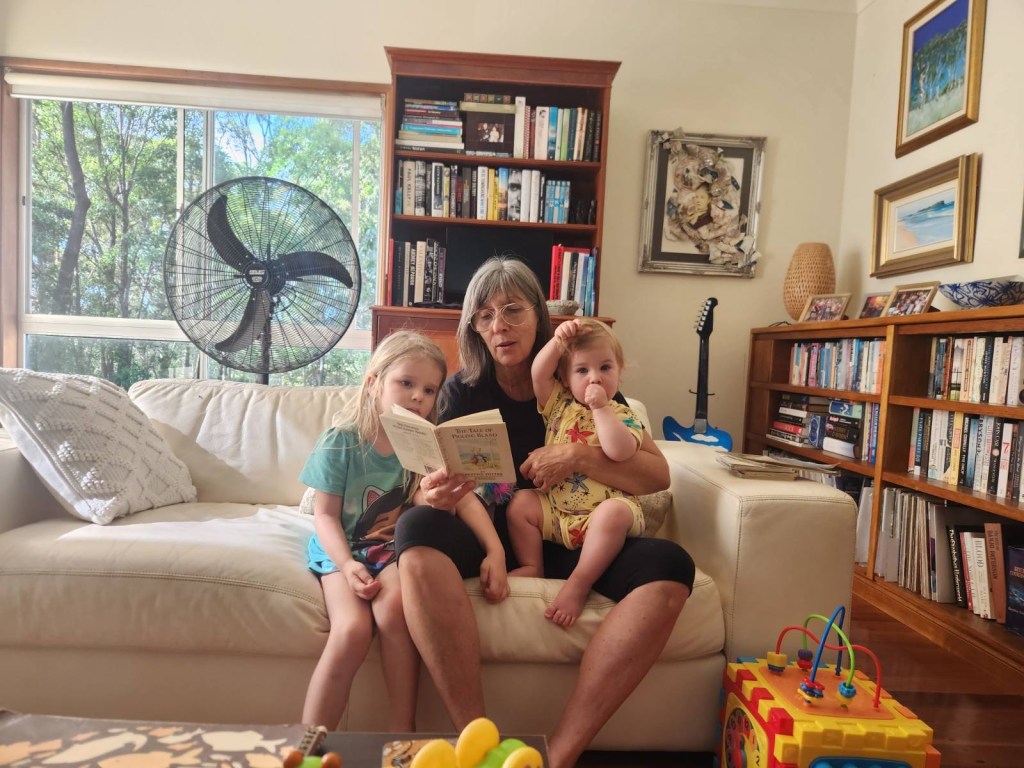 Reading time with granddaughters Ari and Ella.